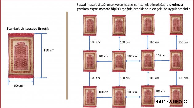a) Namaz kılacaklar arasında sosyal mesafenin sağlanmasını teminen camilerin kapalı alanlarında/avlusunda/bahçesinde ve namaz kılmak için belirlenecek diğer alanlarda, bir kişinin en az 60x110 cm’lik bir alanı (seccadenin kaplayacağı alan) kullanacağı göz önünde bulundurularak, her namaz kılınacak alanın en uç noktalarından her yönden birer metre mesafe olacak şekilde ekte gönderilen şekle uygun zeminde işaretleme yapılacak.