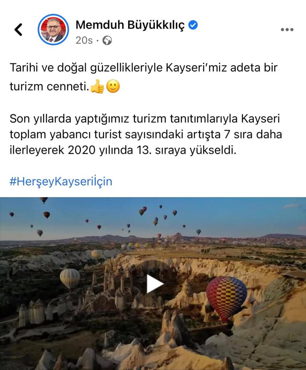 -Memduh Başkan şöyle demiş; Kayseri’nin tanıtımı için yürütülen çalışmalar sonuç vermeye başladı. Kayseri, toplam yabancı turist sayısında 2019 yılında iller arasında 20. sırada yer alırken, 2020 yılında ise 13. sıraya yükseldi.