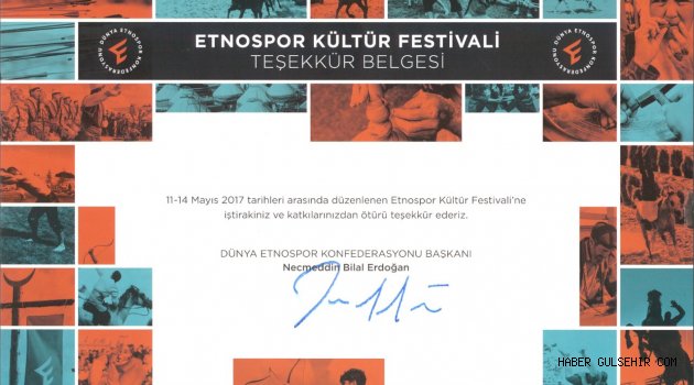 Dünya Etnospor Konfederasyonu Başkanı Bilal Erdoğan imzalı teşekkür belgesinde “ 11-14 Mayıs 2017 tarihinde düzenlenen Etnospor Kültür Festivali’ne iştirakinizden ve katkılarınızdan ötürü teşekkür ederiz “ denildi.