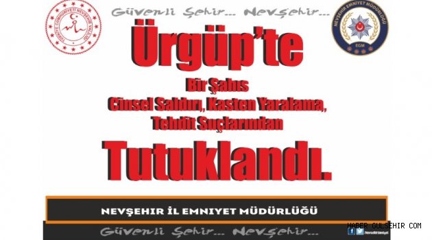 Ürgüp İlçemizde; bayan şahısın müracaatında, 25.02.2019 günü erkek arkadaşının  “kendisini darp ettiğini ve kendisine cinsel saldırıda bulunduğu yönünde şikayeti” üzerine Ürgüp Cumhuriyet Savcılığının emir ve talimatları doğrultusunda başlatılan soruşturma kapsamında,