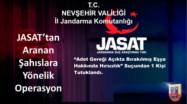 Yapılan açıklamaya göre; Nevşehir İl Jandarma Komutanlığı JASAT (Jandarma Suç Araştırma Timi) ve İl Merkez Jandarma Komutanlığı ekiplerince; emniyet, asayiş ve kamu düzeninin sağlanması kapsamında 09 Kasım 2021 tarihinde icra edilen faaliyet sonucunda; hakkında “Adet Gereği Açıkta Bırakılmış Eşya Hakkında Hırsızlık” suçundan yakalama kararı bulunan Ö.K. isimli şahıs yakalanmış, çıkarıldığı adli makamlarca tutuklanarak Nevşehir E Tipi Kapalı Ceza İnfaz Kurumuna teslim edilmiştir''denildi.