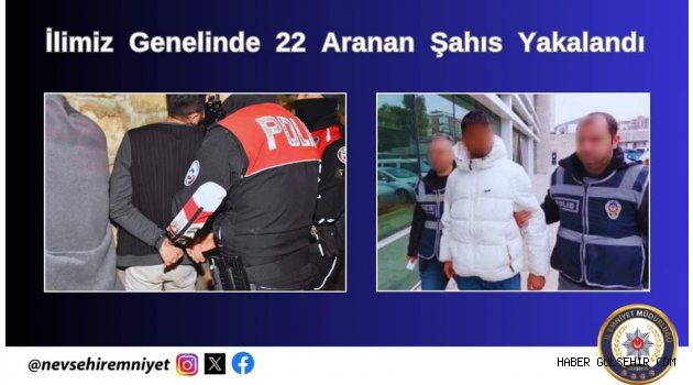 Nevşehir İl Emniyet Müdürlüğü Ekiplerince son bir hafta içerisinde Nevşehir genelinde aranan şahısların yakalanmasına yönelik yapılan çalışmalarda; 22 kişi yakalandı.