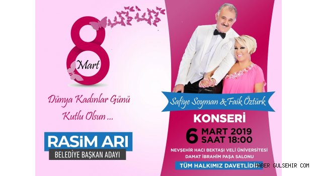 AK Parti Nevşehir Belediye Başkan Adayı Rasim Arı, “8 Mart Dünya Kadınlar Günü” münasebetiyle hazırladıkları etkinlikte Türk Sanat Müziğinin güçlü seslerinden şarkıcı Safiye Soyman ve Faik Öztürk’ün Nevşehir'de Kadınlarla buluşacağını söyledi.
