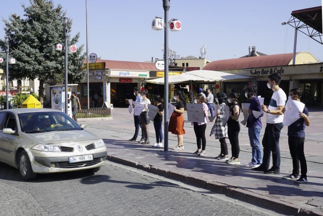 Kapadokya Üniversitesi öğrencileri “20 Eylül Küresel İklim Grevi” etkinlikleri kapsamında küresel iklim değişikliği ve zararlarına dikkat çekmek için Ürgüp’te performans sanatı gerçekleştirdi.