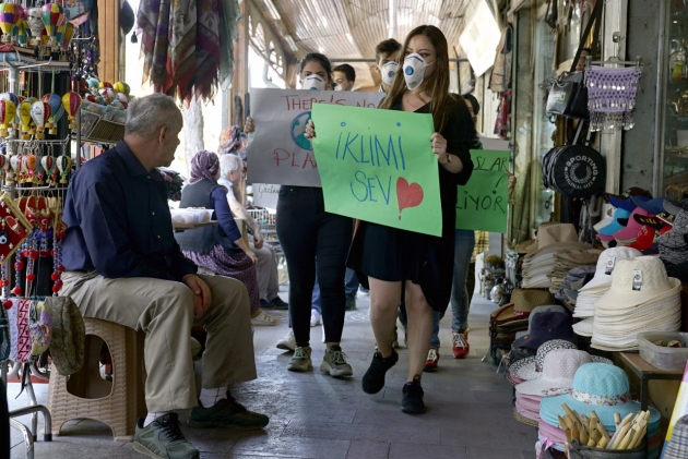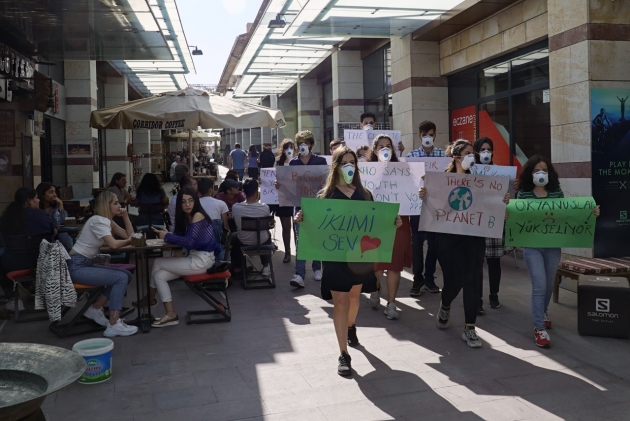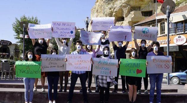 Ürgüp Cumhuriyet Meydanında toplanarak "Sıfır Gelecek" sloganıyla küresel iklim değişikliğine vurgu yapan üniversite öğrencileri, iklim krizinin aciliyeti karşısında hem karar alıcılara seslenmek hem de toplumda farkındalık yaratmak amacıyla koruyucu maskeyle dolaşarak bilinçsiz çevre kirliliği ile sınırların ihlal edildiğine dikkat çektiler.