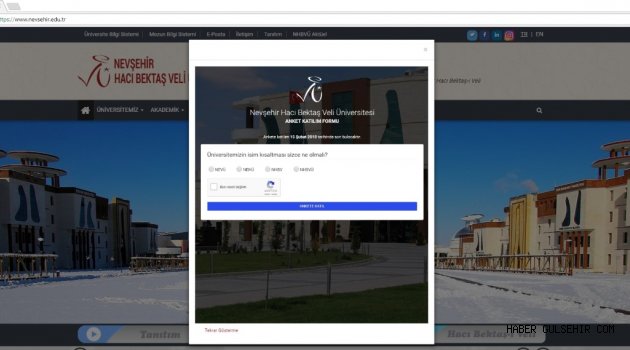 17 Mayıs 2007 yılında ‘Nevşehir Üniversitesi’ olarak kurulan, Cumhurbaşkanı Recep Tayyip Erdoğan’ın onayı ve 7 Kasım 2013 tarihli resmi gazetede yayınlanan kanun gereğince ‘Nevşehir Hacı Bektaş Veli Üniversitesi’ olarak eğitim-öğretimine devam eden Nevşehir Hacı Bektaş Veli Üniversitesi’nin isim kısaltması düzenlenen anketle belirlenecek.
