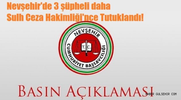 FETÖ/PDY Silahlı Terör Örgütüne Üye Olma suçundan şüpheli ve hakkında Cumhuriyet Başsavcılığımızca soruşturma başlatılan şüpheli Ürgüp İlçesinde Esnaf A.S., Hurdacı Esnafı H.İ. ile sosyal paylaşım sitesinden Cumhurbaşkanına hakaret suçundan hakkında Cumhuriyet Başsavcılığımızca soruşturma başlatılan kafe işletmeni M.A. bugün (05/08/2016 Cuma günü) tutuklanma talebiyle Cumhuriyet Başsavcılığımız tarafından Nevşehir Sulh Ceza Hakimliğine sevk edilmiş, yapılan sorgulama neticesinde Nevşehir Sulh Ceza Hakimliği'nce TUTUKLANMIŞLARDIR.