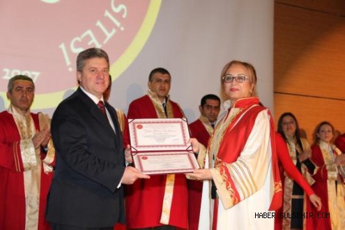 Konuşmaların ardından Rektörümüz Prof. Dr. Filiz Kılıç, Makedonya Cumhurbaşkanı  Dr. Gjorge Ivanov’a ‘Fahri Bilim Doktorluğu Payesi’ni takdim ederek cübbesini giydirdi. Rektörümüzün ayrıca Cumhurbaşkanı Ivanov’a üniversitemiz yayınlarından hediye ettiği tören, Cumhurbaşkanı Ivanov’un uluslar arası ve kültürler arası ilişkiler  alanında verdiği konferans ile son buldu.