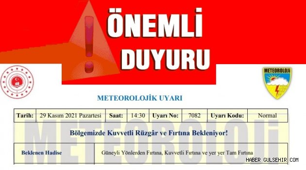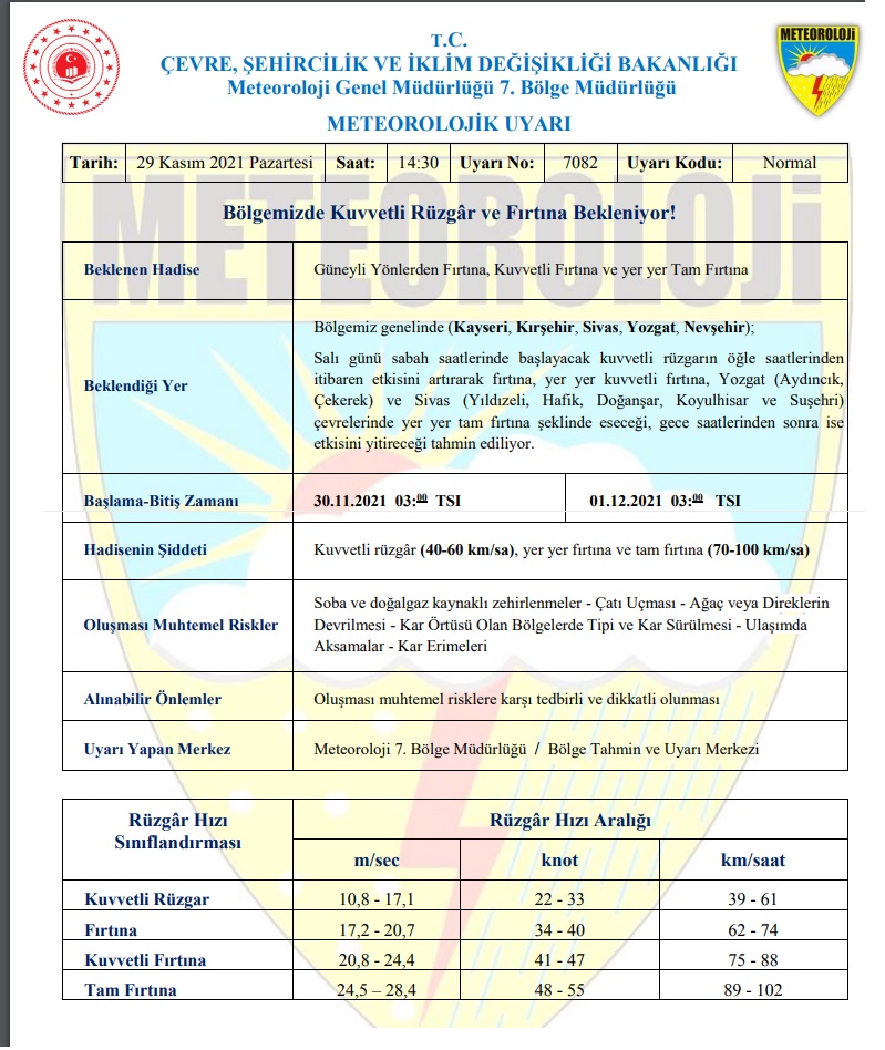 Bölgemiz genelinde (Nevşehir, Kayseri, Kırşehir, Sivas, Yozgat); Salı günü sabah saatlerinden itibaren kuvvetli rüzgar, öğle saatlerinden itibaren etkisini artırarak fırtına ve yer yer kuvvetli fırtına bekleniyor.