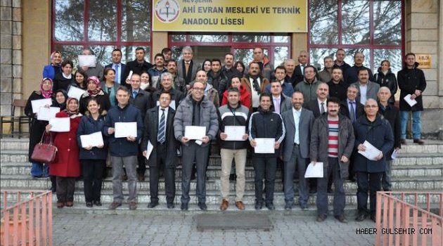 Eğitim kapsamında Ahi Evran Mesleki ve Teknik Anadolu Lisesi Müdürlüğü’nde programa katılan öğretmenler sertifikalarını, Nevşehir Milli Eğitim Müdürü Osman Şimşek , Nevşehir İl Şube Müdürü Ramazan Bıyıklıoğlu ve Sosyal Bilimler Anabilim Dalı öğretim üyesi Doç. Dr. Ali Meydan ‘ dan aldı.
