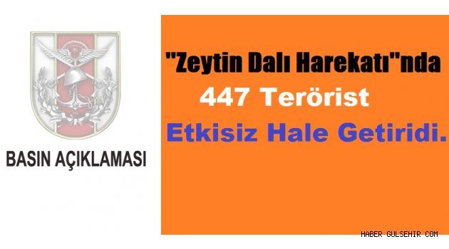 Genelkurmay Başkanlığı Resmi internet sitesinde 27 Ocak 2018 tarihli yapılan Basın açıklamasında “Zeytin Dalı Harekâtı” nda etkisiz hale getirilen Terörist sayısının 447 olduğu belirtildi.