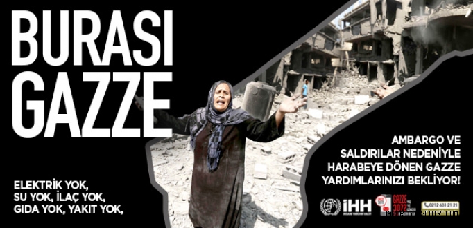 Ambargo ve saldırılar nedeniyle harabeye dönen Gazze, söz konusu sorunu aşabilmesi için şimdi yardımlarınızı bekliyor. 2009 yılında Gazze’de ofis açarak buradaki insani yardım ve kalkınmaya yönelik faaliyetlerine hız veren İHH, Gazze için "Burası Gazze" sloganıyla yeni bir yardım kampanyası başlatıyor.