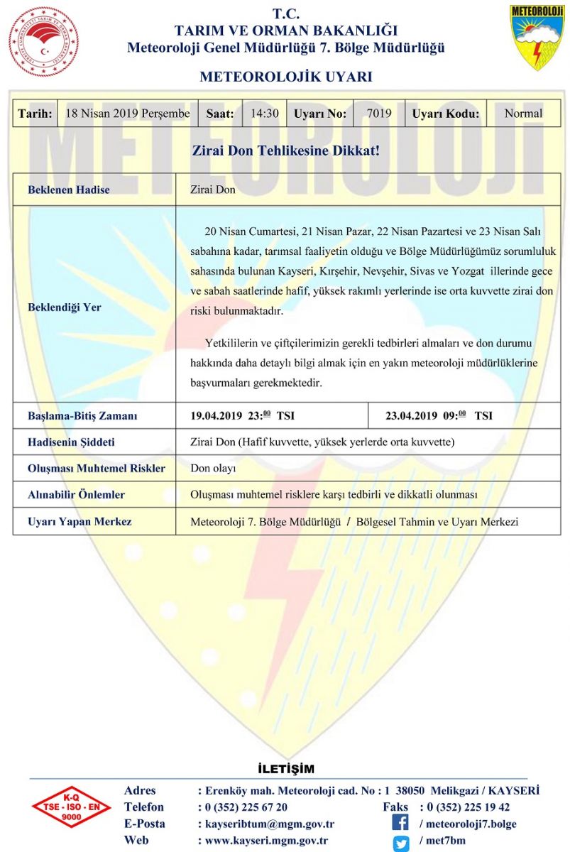 20 Nisan Cumartesi, 21 Nisan Pazar, 22 Nisan Pazartesi ve 23 Nisan Salı sabahına kadar, tarımsal faaliyetin olduğu bölgelerimizden İç Ege, Göller Yöresi ve İç Anadolu Bölgesi ile Bati Karadeniz’in iç kesimlerinde gece ve sabah saatlerinde hafif, yüksek rakımlı yerlerinde ise orta kuvvette zirai don riski bulunmaktadır.