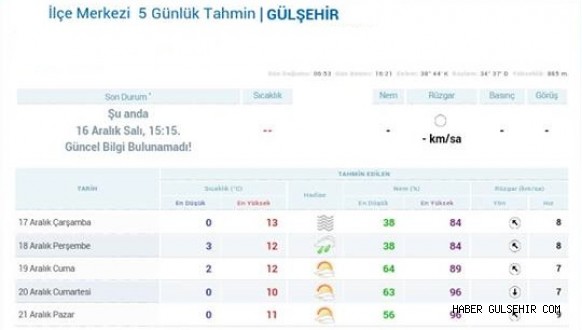 GÜLŞEHİR İlçe Merkezi 5 Günlük Tahmin