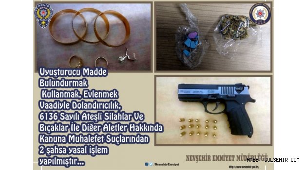 Karakola götürülen Şahıslar hakkında; “6136 Sayılı Ateşli Silahlar Ve Bıçaklar İle Diğer Aletler Hakkında Kanuna Muhalefet, Uyuşturucu Madde Bulundurmak ve Kullanmak, Evlenmek Vaadiyle Dolandırıcılık Suçlarından” yasal işlem yapıldı.