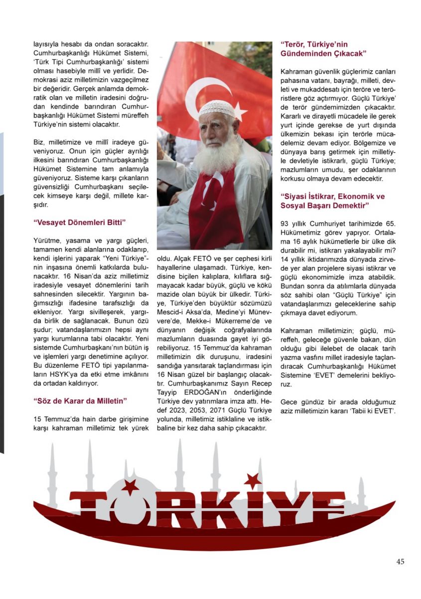 Kahraman milletimizin; güçlü, müreffeh, geleceğe güvenle bakan, dün olduğu gibi ilelebet de olacak tarih yazma vasfını millet iradesiyle taçlandıracak, Cumhurbaşkanlığı Hükümet Sistemine ‘EVET’ demelerini bekliyoruz.