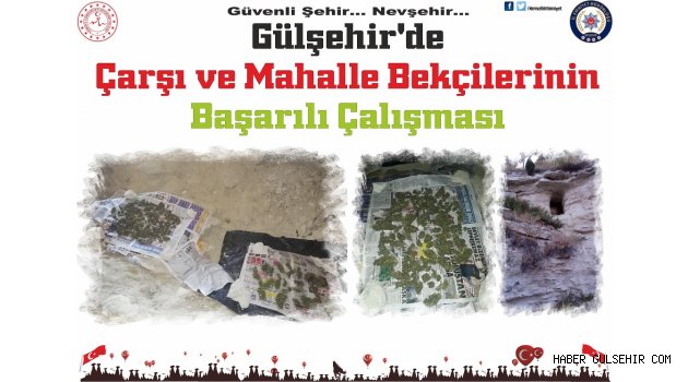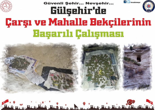 Gülşehir ilçemizde; Çarşı ve Mahalle Bekçileri yaya devriyesi sırasında Cumhuriyet mahallesi Kartal otel altındaki mağaralarda madde kullanımını önlemek amaçlı devriye görevi ifa ettikleri sırada; Oda şeklinde oyulmuş yaklaşık 15 metre genişliğinde olan mağarada gazete ve poşetlerin üzerinde kurutulmak üzere serili vaziyette 314 gr. Hint Keneviri ele geçirdi.
