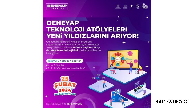 Deneyap Teknoloji Atölyeleri, Türkiye’nin yetenekli çocuklarını geleceğe hazırlıyor. Edirne’den Kars’a yurdun 81 ilinde 139 Deneyap Teknoloji Atölyesinde on binlerce öğrenciye Robotik ve Kodlamadan Nanoteknolojiye, Tasarım ve Üretimden Yapay Zekaya 11 farklı eğitim veriliyor. Milli Teknoloji Hamlesinin dip dalgasını oluşturmaya aday gençler için başvurular 7 Şubat’ta başladı. Yeni öğrencilerini bekleyen Deneyap Teknoloji Atölyeleri için son başvuru tarihi ise 25 Şubat 2024.