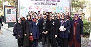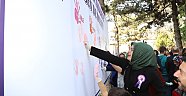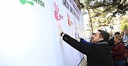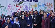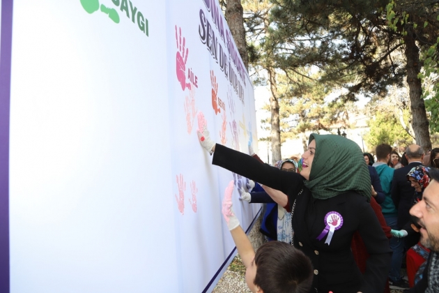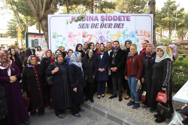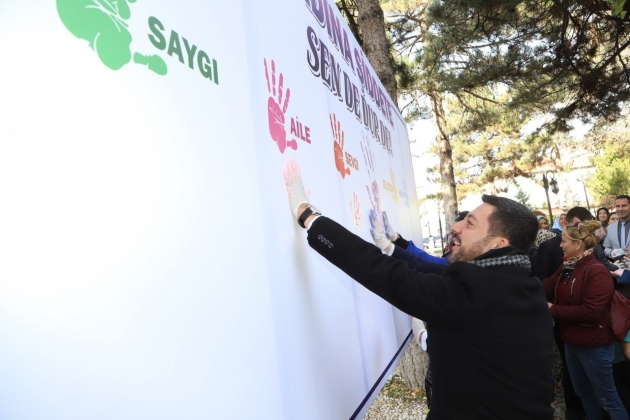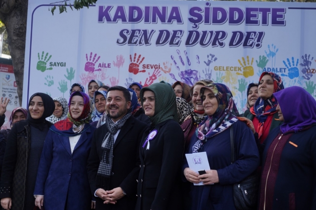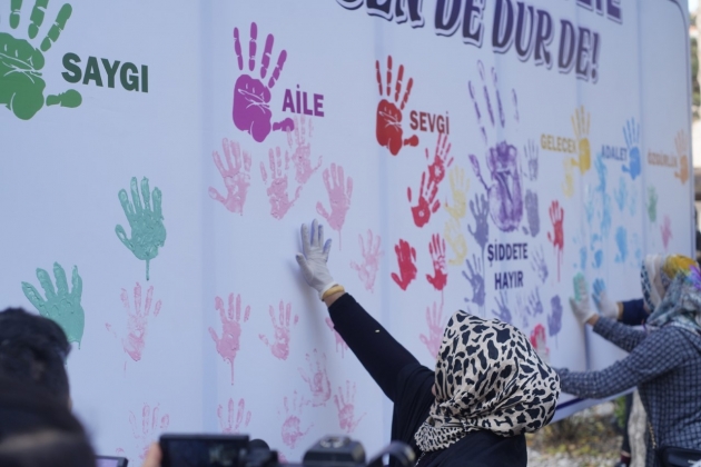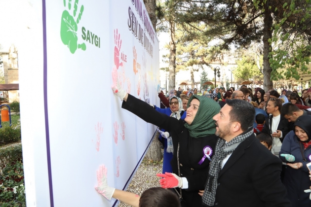 Daha sonra Belediye Başkanı Rasim Arı, eşi Melek Arı, AK Parti Kadın Kolları Başkanı Ayşe Bilgiç ve etkinliğe katılan kadınlar hep birlikte ‘Kadına Şiddete Sende Dur De!’ yazılı brandaya farkındalık oluşturmak için boya ile el bastılar.