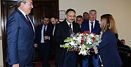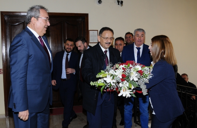 Nevşehir Belediyesi önünde Belediye Başkanı Hasan Ünver tarafından törenle karşılanan Çevre ve Şehircilik Bakanı Mehmet Özhaseki’ye, başkanlık makamında bir de çiçek takdim edildi.