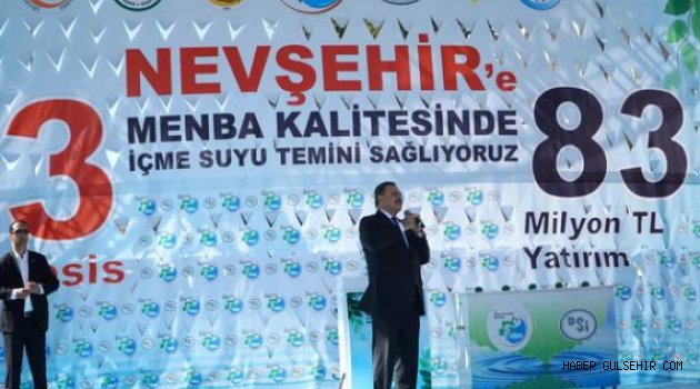 “Nevşehir'e Menba Kalitesinde İçme Suyu Sağlıyoruz” diyen Prof. Dr. Veysel Eroğlu, 42 milyon 748 bin liraya mal olacak içmesuyu arıtma tesisi ile Nevşehir’in içme suyu ihtiyacını güvence altına alacaklarını vurgulayarak “Nevşehir merkez başta olmak üzere Sulusaray, Nar ve Göre beldelerinin 2045 yılına kadar içme ve kullanma suyu ihtiyaçlarını karşılayacağız. Proje tamamlandığında yılda 14 milyon metreküp su arıtılacak. Nevşehir’ imize Menba kalitesinde içmesuyu sağlıyoruz”dedi. Nevşehir’e kazandırılacak bu tesisler ile birlikte 19.350 dekarlık zirai alanın suya kavuşacağını ifade eden Eroğlu, 7 bin dekar zirai arazide de yenileme yapılarak yılda 11 milyon net gelir artışı elde edileceğini kaydetti.