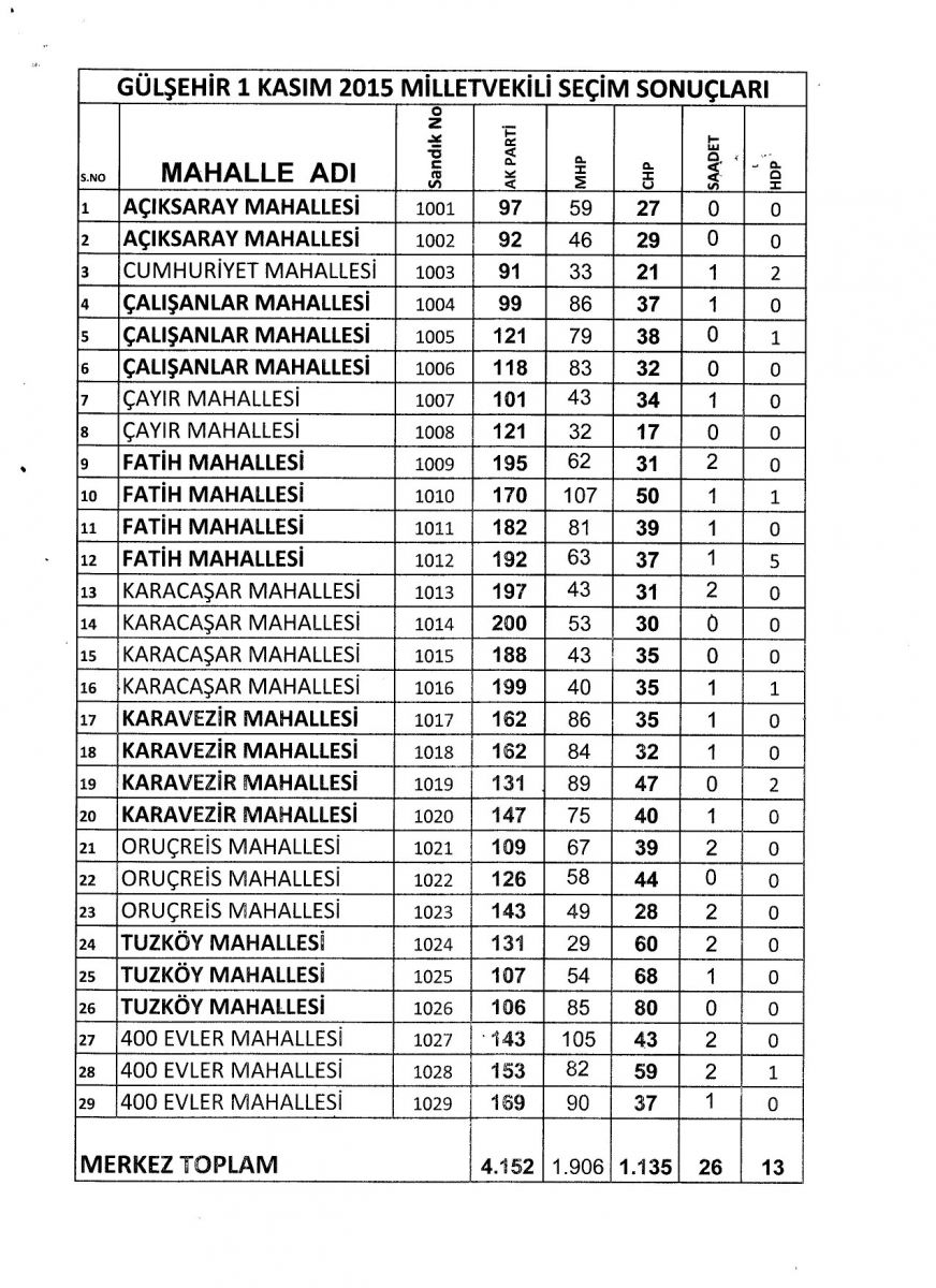 1 Kasım 2015 Pazar Günü gerçekleştirilen Genel seçimlerde Haber Merkezimiz Haber Gülşehir.com olarak edindiğimiz Gülşehir Mahalle ve Köylerinin bulunduğu seçim sonuç listesi.