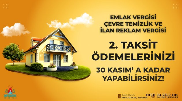 Her yıl Mayıs ve Kasım aylarında olmak üzere 2 eşit taksitte ödenen konut ve işyerlerine ait Emlak ve Çevre Temizlik Vergisi ile işyerlerine ait İlan ve Reklam Vergisi 2021 yılı ikinci taksiti ödemeleri 30 Kasım Salı günü mesai bitimine kadar yapılabilecek.