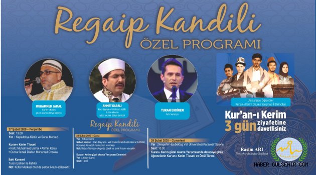 Açılışı 27 Şubat Perşembe günü Kapadokya Kültür ve Sanat Merkezi’nde gerçekleştirilecek olan Regaip Kndili Özel Programı’nda; Kur’an-ı Kerim Güzel Okuma Dünya Birincisi Muhammed Jamal, Hacı Bayram-ı Veli İmam Hatibi ve Kur’an-ı Kerim Güzel Okuma Dünya Birincisi Ahmet Karalı ve ünlü hafızlar Oumar İsmail Diallo ve Mohammad Chouka Kuran-ı Kerim Tilaveti ile Nevşehirlilere unutamayacakları bir gece yaşatacak.