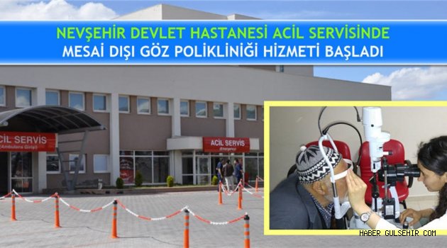 Nevşehir Kamu Hastaneleri Birliği Genel Sekreterliğine bağlı Nevşehir Devlet Hastanesi Acil Servisinde oluşturulan Göz Polikliniği ile halkımızın daha iyi hizmet alabilmesi için; Hafta içi Cuma Hariç Her Gün Mesai Sonrası, Hafta Sonu Cumartesi Günü Göz Polikliniği 17:00 - 20:00 saatleri arasında Göz Hastalıkları Uzman Hekimlerimiz tarafından verilmeye başlanmıştır.