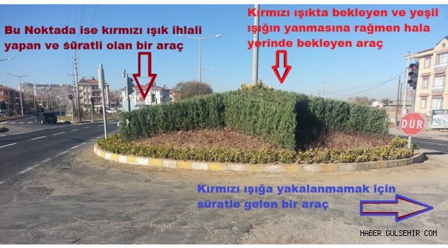 Vatandaşlarımız tarafından Haber merkezimiz Haber Gülşehir.com'a gelen şikayetler doğrultusunda Nevşehir caddesi ışıklar mevkii'nde bulunan alanın gözlemlerini yaptık. Yaptığımız gözlemlerde Trafik kazasına neden olabilecek ihtimaller ile karşılaştık.Bu ihtimalleride aşagıdaki fotoğraflarda çizim ile belirttik.
