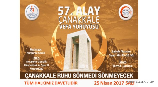 Gençlik ve Spor Bakanlığı'nın Çanakkale Savaşları'nda kahramanlıklarıyla destanlaşan 57, Alay Piyade Alay'ı Şehitleri başta olmak üzere Çanakkale Şehitleri'ni anmak, onları yâd etmek için her yıl düzenlediği "57. Alay Vefa Yürüyüşü" bu sene tüm Türkiye'de 81 il ve İlimizde Çanakkale ile birlikte aynı gün ve saatte tüm geçlerimiz ve Nevşehir'lilerin katılımı ile 25 Nisan 2017 Salı günü gerçekleştirilecek.