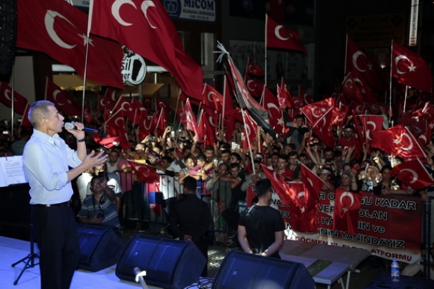Allah'tan 15 Temmuz gecesini bu millete bir daha göstermemesini dileyen sanatçı Mustafa Yıldızdoğan, "Milli Mücadele yıllarında bu yüce millet 7 düvele karşı mücadele verdi. Düşman Ankara yakınlarına kadar geldi,  Ama hiçbir şekilde Türkiye Büyük Millet Meclisi(TBMM)’ni bombalamadı.   Ama bu şerefsizler gazi meclimize bomba atarak hainliklerini tescillediler.  Bu haberi alan evdeki analarımız, bacılarımız eşarbını başına takıp ay yıldızlı bayrağını alıp meydanlara çıktı. Bizim Nene Hatunlarımız, Şerife bacılarımız oldular" diye konuştu.