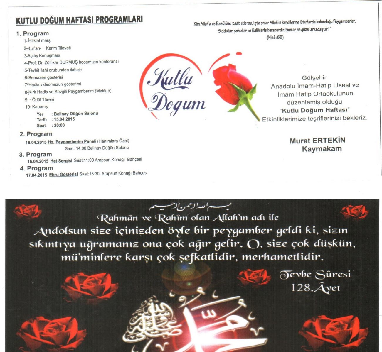 Yüce Peygamber Efendimiz Hazreti Muhammed Mustafa(S.A.V.)’in dünyaya teşriflerinin 1444. Yılı nedeniyle Kutlu Doğum Haftası etkinlikleri kapsamında Gülşehir İlçe Müftülüğü ile Gülşehir İlçe Milli Eğitim Müdürlüğü tarafından15.04.2015 ile 17.04.2015 Tarihleri arasında  ortaklaşa Gerçekleştirilecek.