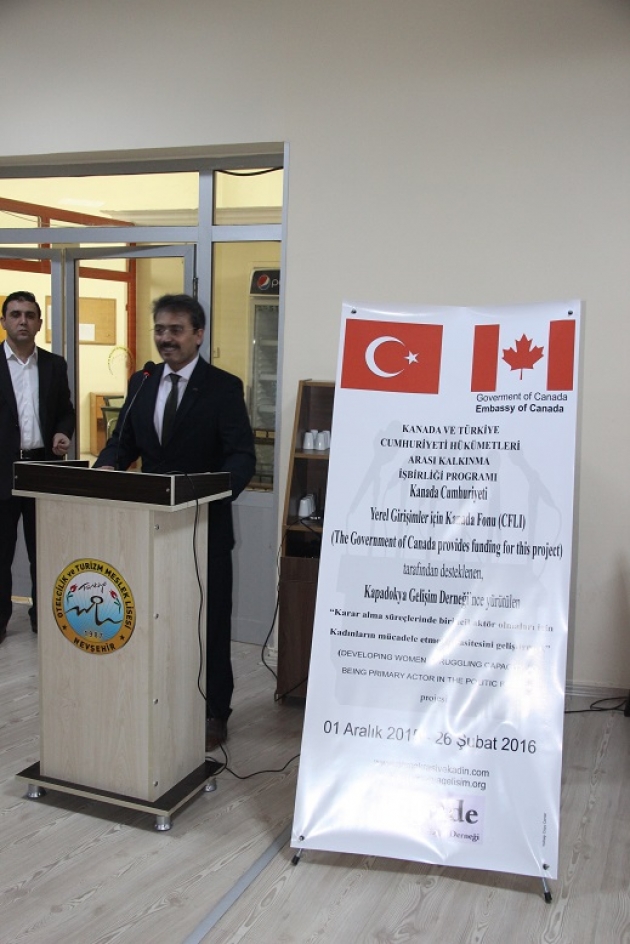 Nevşehir Vali Yardımcısı Sn. Vural DEMİRTAŞ yaptığı konuşmada “bugüne kadar toplumsal cinsiyet eşitliğinin sağlanması amacıyla STK ve Kamu işbirliği içerisinde en çok kadına yönelik şiddet ve erken evlilik gibi konular üzerinde çalışıldığını ve bu alanlarda artık başta medya olmak üzere toplumun tüm kesimlerinde belli bir farkındalık oluşturulduğunu, ancak başta siyasal ve ekonomik alanlar olmak üzere demokratik karar süreçlerinde kadınlar açısından toplumsal cinsiyet eşitliğinin sağlanması yönünde aynı farkındalığın henüz sağlanamadığını, bu sebeple Kanada Büyük Elçiliği tarafından desteklenen ve Kapadokya Gelişim Derneği tarafından yürütülecek olan bu projenin, yenilikçi bir konuyu ele aldığını ve kadınların demokratik karar alma süreçlerinde etkin olmaları için büyük katkı sağlayacağını” belirtti.