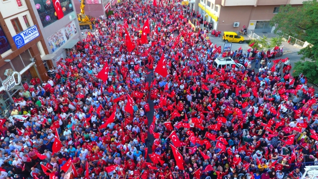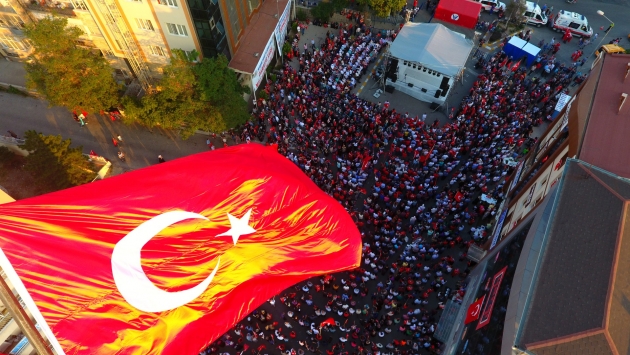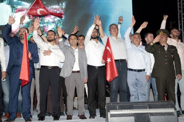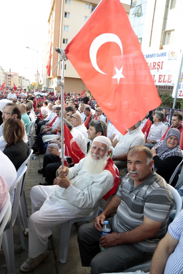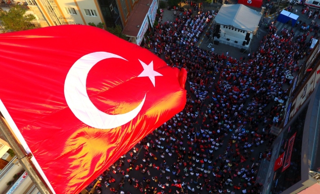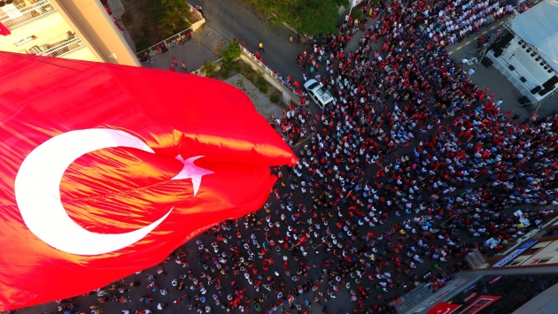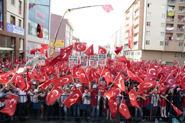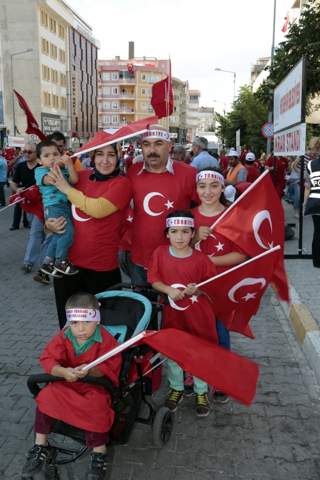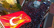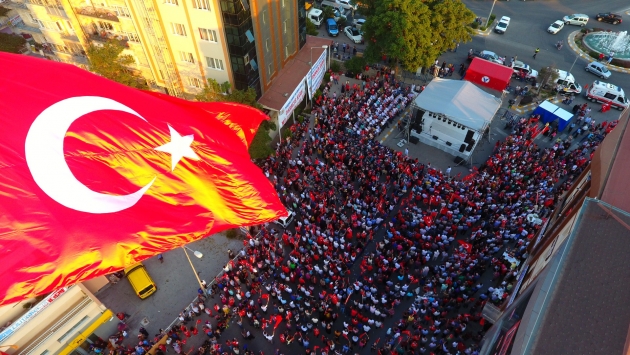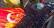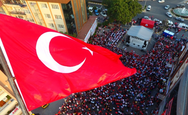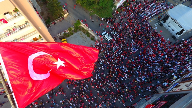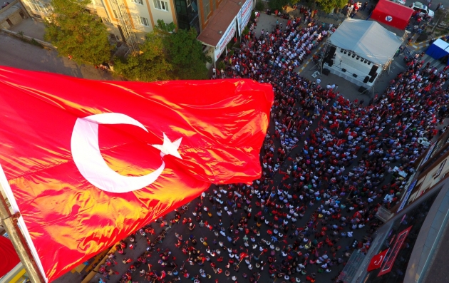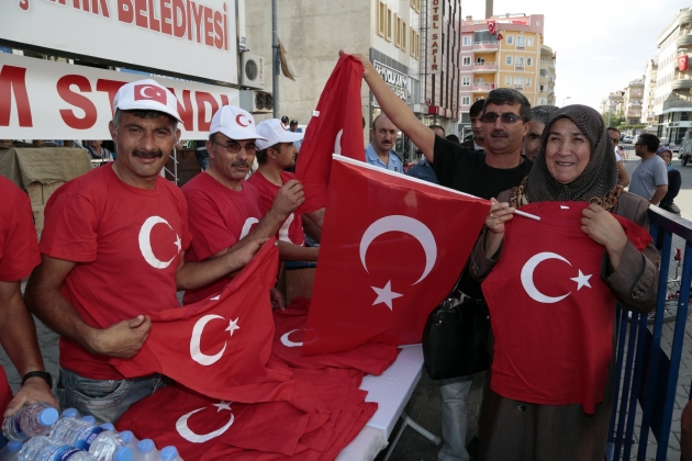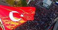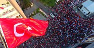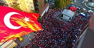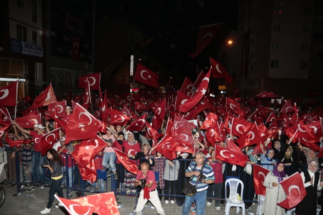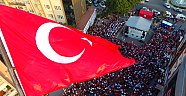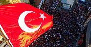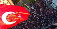 Diriliş Meydanı’nda bir vinç yardımıyla yerden metrelerce yükseğe çıkartılan Türk Bayrağı ve mitinge katılan binlerce vatandaş ellerindeki Türk Bayrakları ile büyük bir sevgi yumağı oluşturdu.