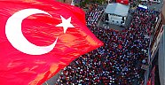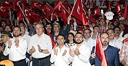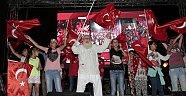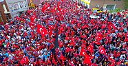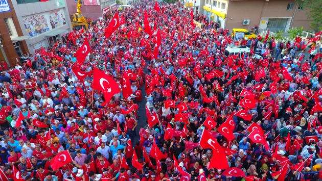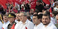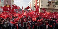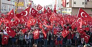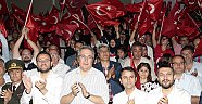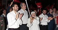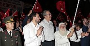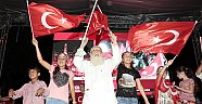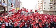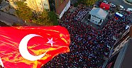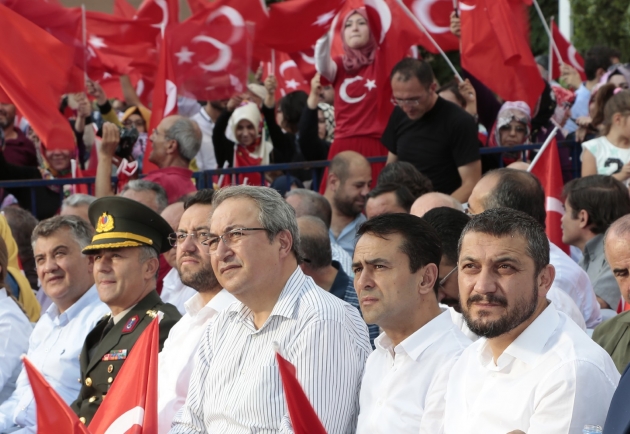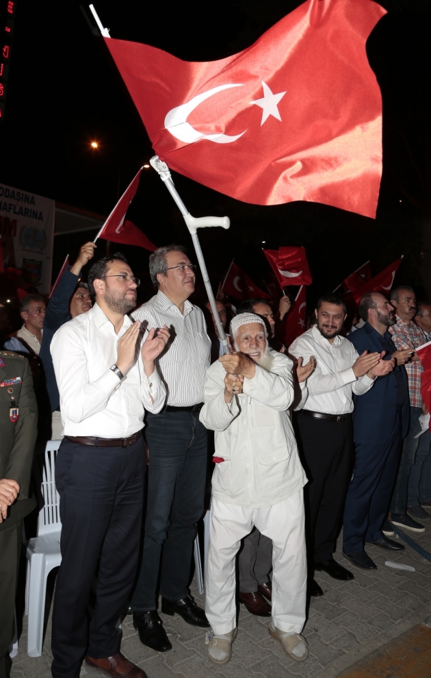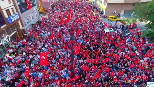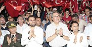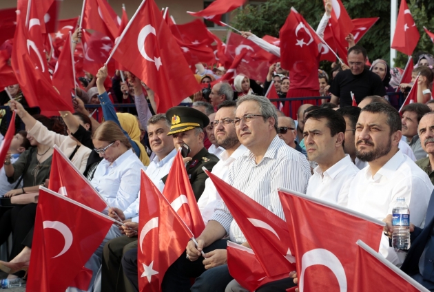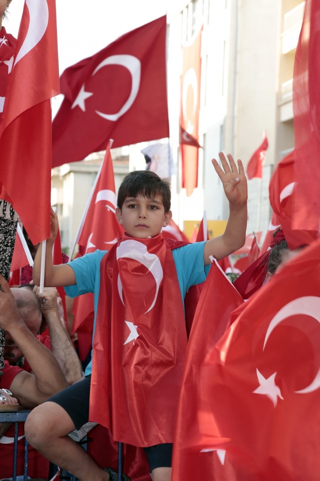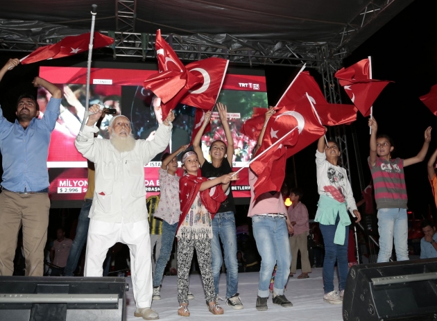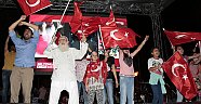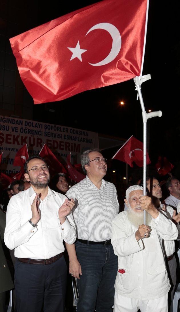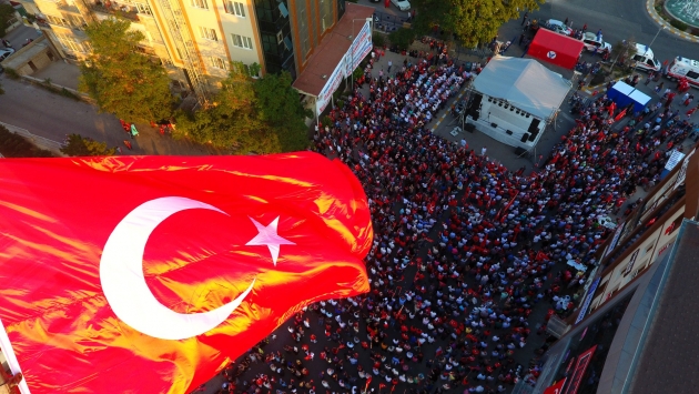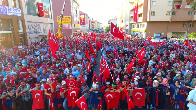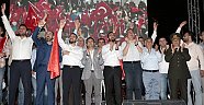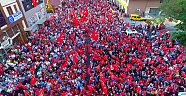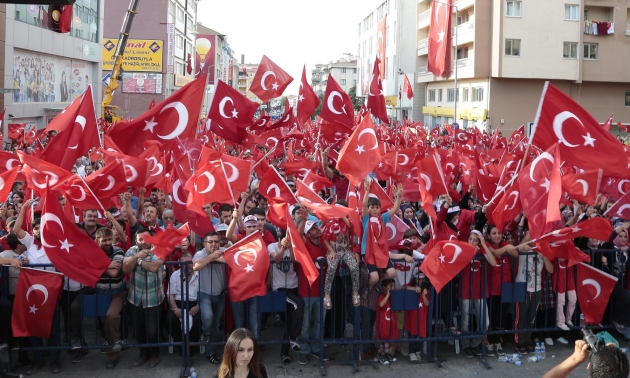 Diriliş Meydanı’nda bir vinç yardımıyla yerden metrelerce yükseğe çıkartılan Türk Bayrağı ve mitinge katılan binlerce vatandaş ellerindeki Türk Bayrakları ile büyük bir sevgi yumağı oluşturdu.