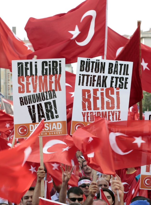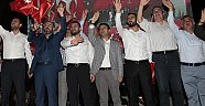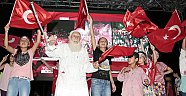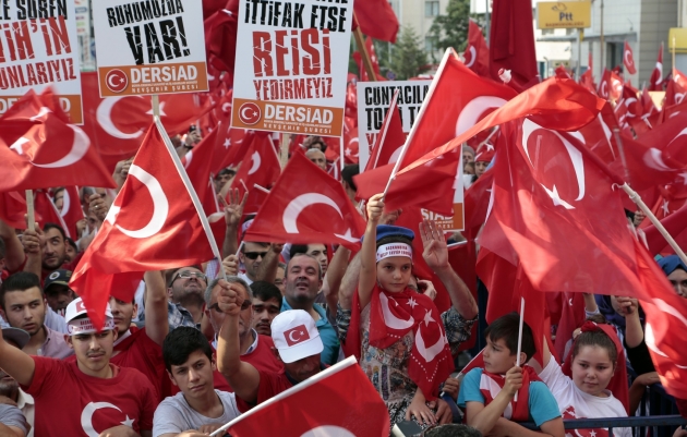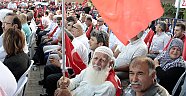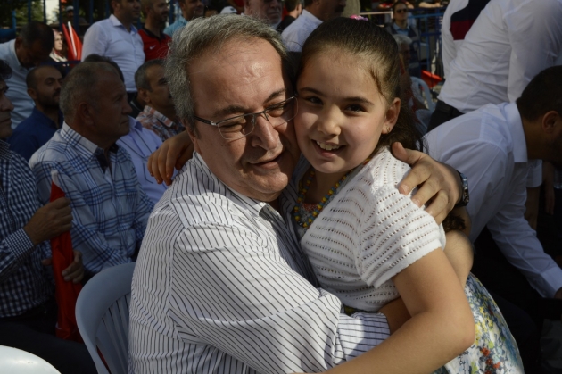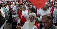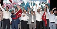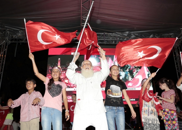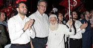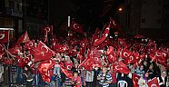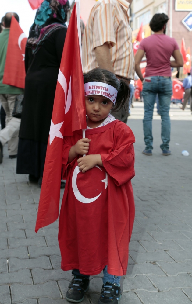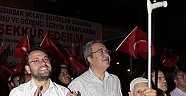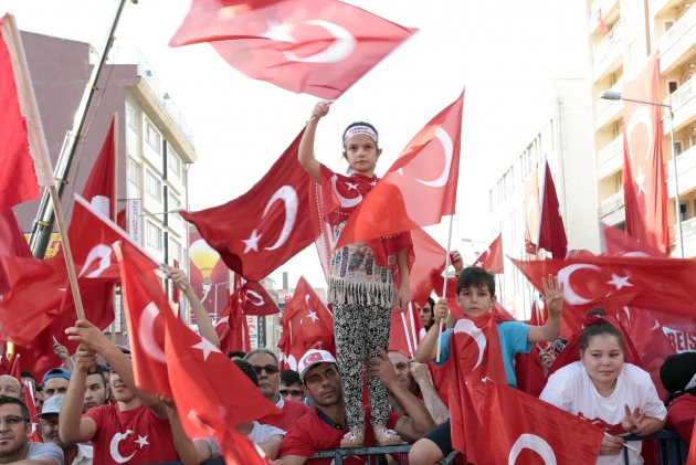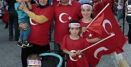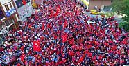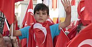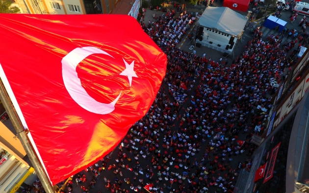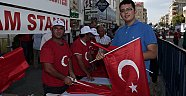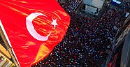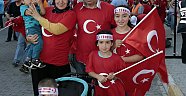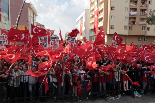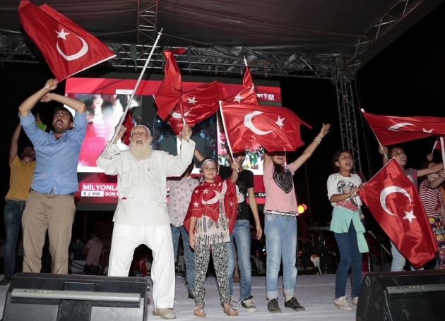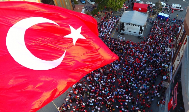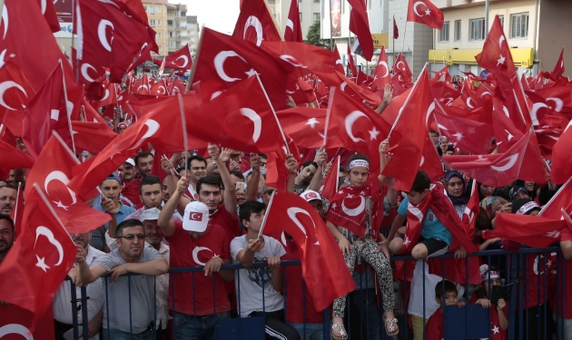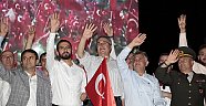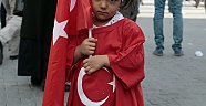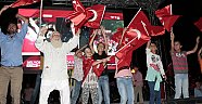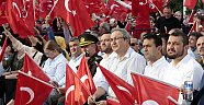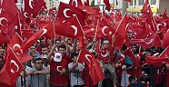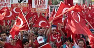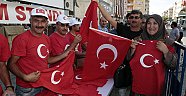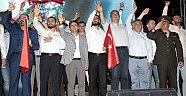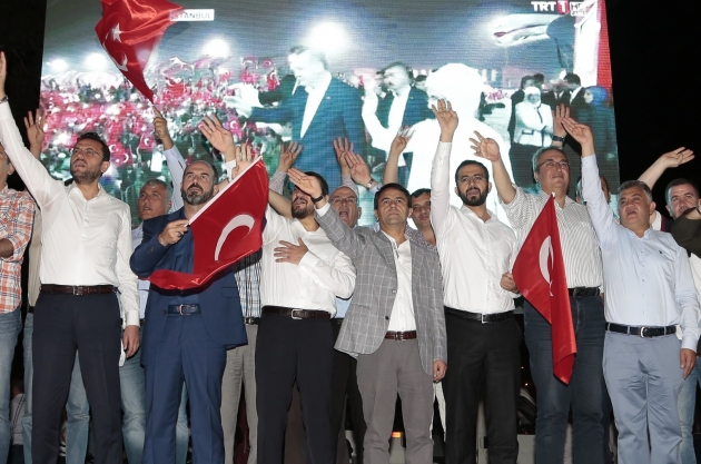 Diriliş Meydanı’nda bir vinç yardımıyla yerden metrelerce yükseğe çıkartılan Türk Bayrağı ve mitinge katılan binlerce vatandaş ellerindeki Türk Bayrakları ile büyük bir sevgi yumağı oluşturdu.