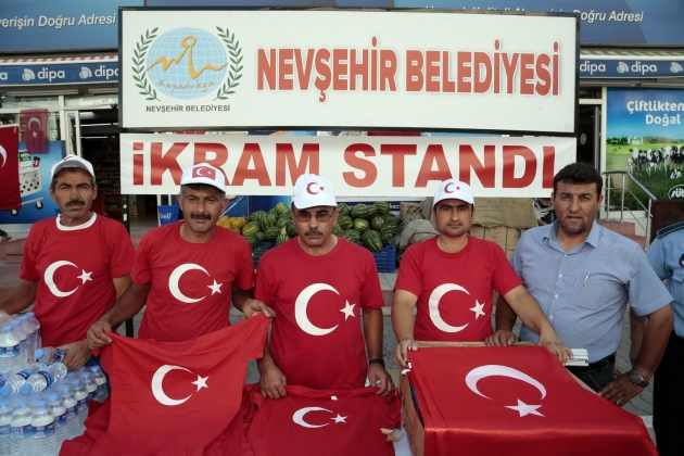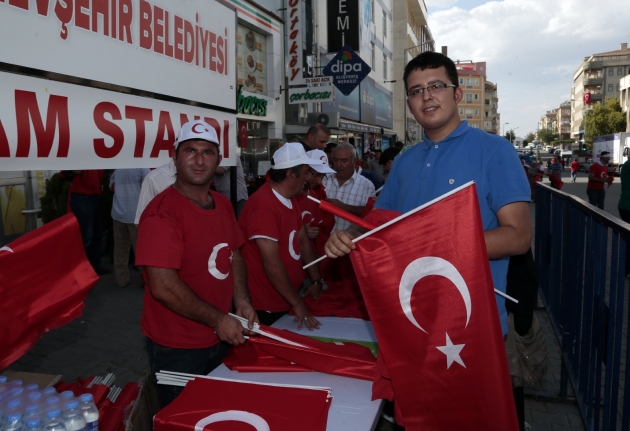 Nevşehir Belediyesi ekipleri, Diriliş Meydanı’ndaki Demokrasi ve Şehitler Mitingine katılan vatandaşlara binlerce Türk Bayrağı dağıttı.