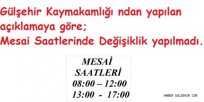 Nevşehir İlindeki kamu kurum ve kuruluşlarının mesai saatlerinde, 657 sayılı Devlet Memurları Kanununun 100. maddesi gereğince, 27 Ekim 2014 Pazartesi gününden itibaren aşağıda belirtildiği şekilde, mevcut uygulamaya devam edileceği Valilik Makamınca bildirilmiştir.