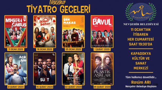 Nevşehir Belediyesi tarafından düzenlenen ‘Tiyatro Geceleri’ ile birlikte 11 Ocak 2020 tarihinden itibaren her Cumartesi bir tiyatro oyunu sahnelenecek. 29 Şubat tarihine kadar sürecek olan ve Türk tiyatrosunun birbirinden değerli oyuncularının yer alacağı 8 oyunun bilet gelirlerinin tamamı ile engelli vatandaşlara akülü araba alınacak.