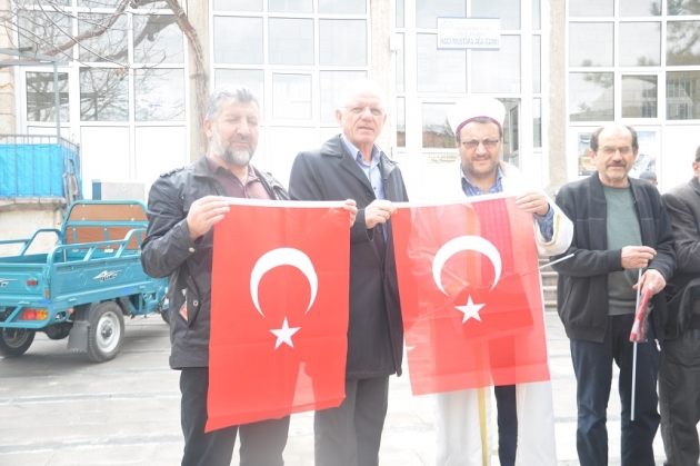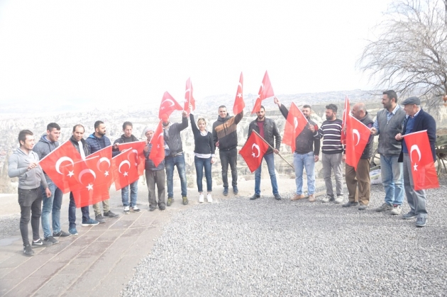 Göreme Belediyesi, Türk Silahlı Kuvvetlerinin Afrin'de terör örgütlerine yönelik gerçekleştirdiği 'Zeytin Dalı Harekatı'na destek amacıyla, esnafa iş yerlerine ve camii çıkışında evlerine asmaları için Türk bayrağı dağıttı. Ülkeyi terör tehdidinden korumak ve bölgeyi huzura kavuşturmak amacıyla Türk Silahlı Kuvvetlerinin başlattığı 'Zeytin Dalı Harekatı'na vatandaşlar da dualarıyla destek veriyor. Göreme Belediyesi’de, Afrin'de terör örgütlerine yönelik başlatılan Zeytin Dalı Harekatına destek amacıyla esnafa Türk bayrağı dağıttı. Bağımsızlığın ve milli birliğin sembolü olan bayrağı alıp öpen ve iş yerlerine asan esnaf, bol bol dua etti. Dağıtılan bayraklardan dolayı esnaf ve vatandaşlar Başkan Cingil’e teşekkür etti.