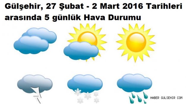 Meteoroloji Genel Müdürlüğü tarafından yapılan hava tahminlerine göre Gülşehir'in 27 Şubat - 2 Mart 2016 Tarihleri arasında 5 günlük Hava Durumu şu şekilde olması bekleniyor.