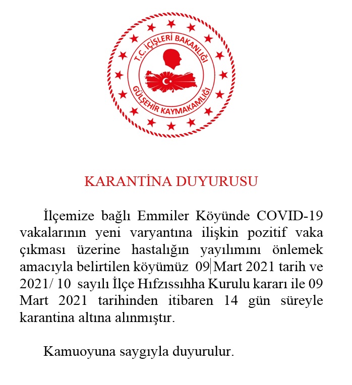 İlçemize bağlı Emmiler köyünde COVID-19 vakalarının yeni varyantına ilişkin pozitif vaka çıkması üzerine hastalığın yayılımını önlemek amacıyla belirtilen köyümüz 09 Mart 2021 tarih ve 2021/10 sayılı İlçe Hıfzıssıhha Kurulu kararı ile 09 Şubat 2021 Salı gününden itibaren 14 gün süreyle karantina altına alınmıştır.
