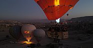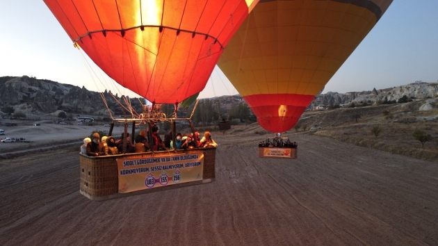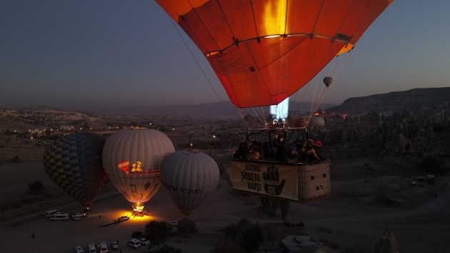 Gün doğumundan önce Göreme beldesinde uçuş için hazırlanan balonlar, sepetlerine yolcuların alınmasının ardından görevlilerce takılan üzerinde kadına yönelik şiddete dikkat çeken mesajların yer aldığı pankartlarla Kapadokya semalarına yükseldi.