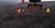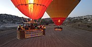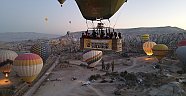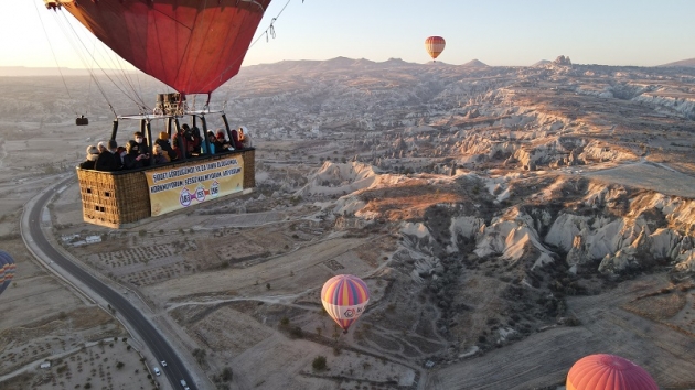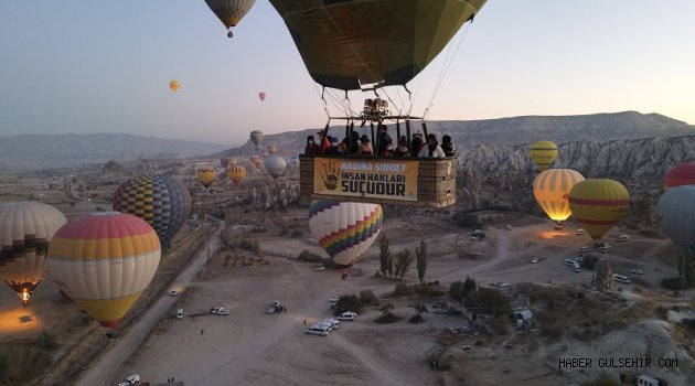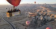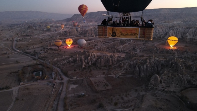 Türkiye'nin önemli turizm merkezlerinden Kapadokya bölgesindeki sıcak hava balonları bu sabahki uçuşlarını, sepetlerine asılan pankartlarla gerçekleştirdi.