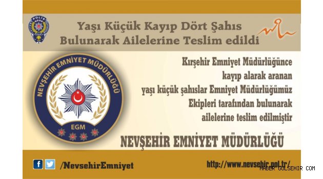 Kırşehir Emniyet Müdürlüğünce kayıp alarak aranan yaşı küçük O.A., Ö.M., Ş.N.K., ve M.İ. isimli çocuklar Emniyet Müdürlüğümüz Çocuk Şube Müdürlüğü ekipleri tarafından bulunarak ailelerine teslim edilmiştir.''denildi.