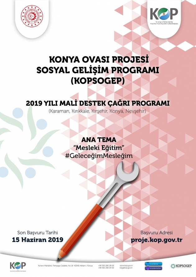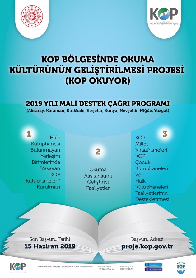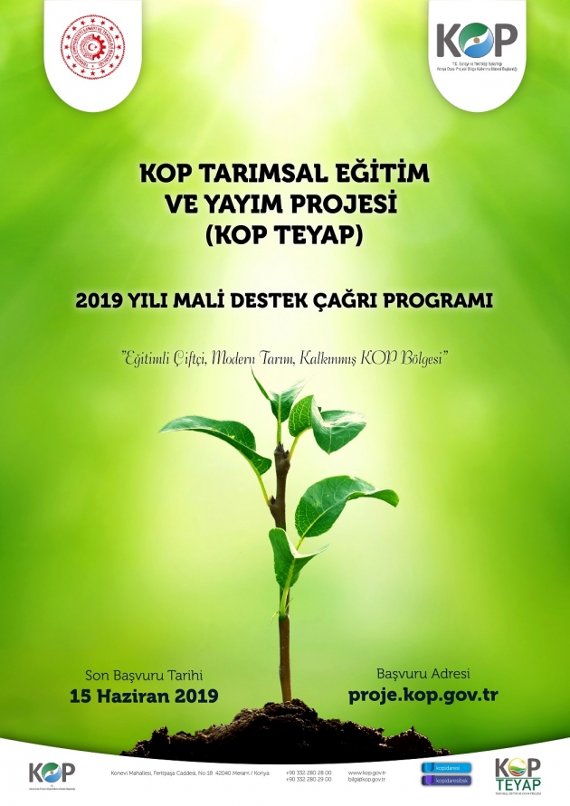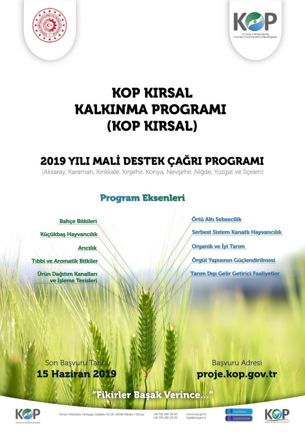 Sanayi ve Teknoloji Bakanlığına bağlı Konya Ovası Projesi (KOP) Bölge Kalkınma İdaresi Başkanlığı, KOP Kırsal Kalkınma (KOP KIRSAL), KOP Tarımsal Eğitim ve Yayım Projesi (KOP TEYAP), KOP Bölgesinde Okuma Kültürünün Geliştirilmesi Projesi (KOP Okuyor) ve KOP Sosyal Gelişim Programı (KOPSOGEP) kapsamında eşzamanlı olarak 2019 Yılı Mali Destek Çağrı Programına çıkıyor.
