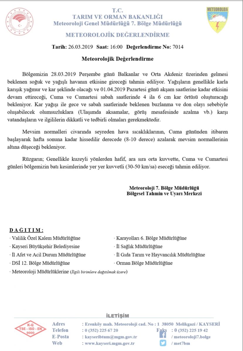 Yağışların genellikle karla karışık yağmur ve kar şeklinde olacağı ve 01.04.2019 Pazartesi günü akşam saatlerine kadar etkisini devam ettireceği, Cuma ve Cumartesi sabah saatlerinde 4 ila 6 cm kar örtüsü oluşturacağı bekleniyor. Kar yağışı ile gece ve sabah saatlerinde beklenen buzlanma ve don olayı sebebiyle oluşabilecek olumsuzluklara (Ulaşımda aksamalar, görüş mesafesinde azalma vb.) karşı vatandaşların ve ilgililerin dikkatli ve tedbirli olmaları gerekmektedir.
