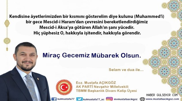 TBMM Başkanlık Divanı Kâtip Üyesi AK Parti Nevşehir Milletvekili Ecz. Mustafa AÇIKGÖZ, miraç kandili münasebetiyle mesaj yayınladı.