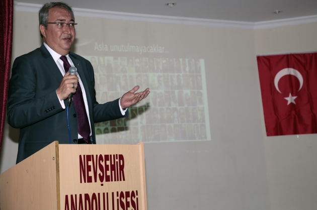 Nevşehir Millî Eğitim Müdürü Murat Demir’ de 40 yıldan beri devletin en üst kademelerine yerleşerek bu milletin verdiği vergilerle satın alınan helikopter, tank ve savaş uçakları ile TBMM ne saldırmaktan çekinmeyen ve bu ülkenin güvenliği adına önemli bir misyon üstlenen Özel Hareket Komutanlığına bombalı saldırı düzenleyerek 241 vatan evladını şehit eden ve 2 bini aşkın vatan evladının da yaralanmasına neden olanları, Türk Milletinin asla unutmayacağını belirtti. İhanet şebekesinin, bundan sonraki süreçte de ihanete devam edeceğini aktaran Demir, gençlerden geleceklerini yok etmek isteyen bu şer odaklarına karşı daha duyarlı olmaları çağrısında bulunarak şer odaklarının oyunlarının farkına varmalarını ve oyunlarına asla alet olmamaları gerektiğini ifade etti.